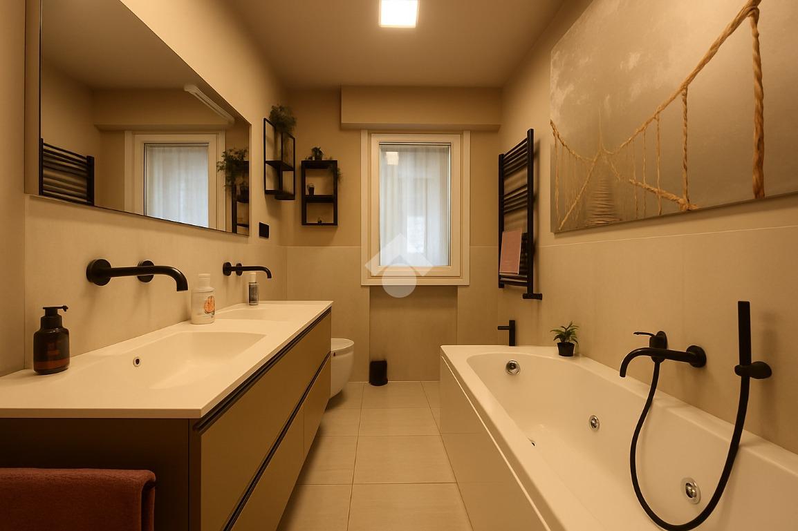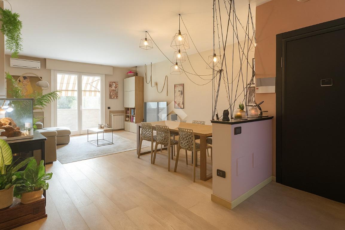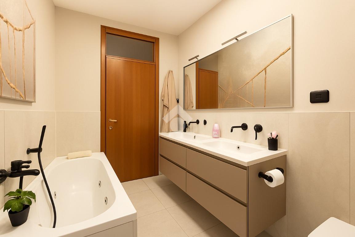 Accedendo alla soluzione entriamo nel soggiorno di 30mq con affaccio sulla balconata anch’essa rifinita con la stessa pavimentazione interna, dove sono stati personalizzati anche i parapetti con inserti in pietra.